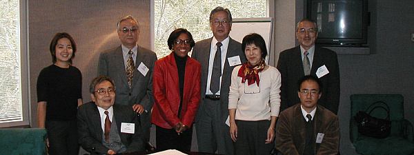 AARP本部で。AARP新会長および「自立センター・高齢協合同調査団」 左から、山下順子さん、中西正司さん、藤田由紀雄さん、マリー・スミス会長、岡安、玄幡真美さん、松本憲一さん(後)、降幡博亮さん(前)。西尾直子さん 撮影 |