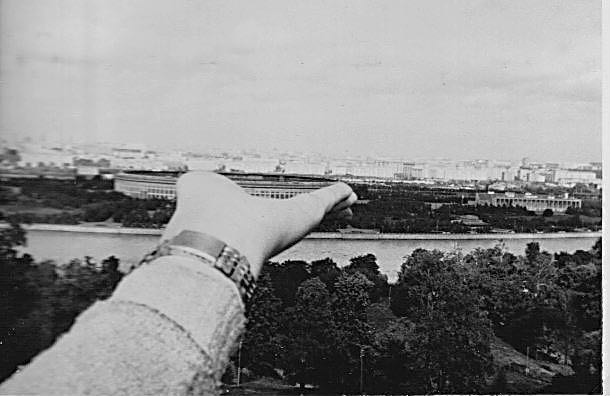 モスクワ大からクレムリン方面を望む。スタジアムの手前がモスクワ川。