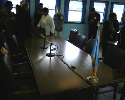 南北会談机。この机が「38度線上」にある、と説明を受ける。見学者は机の周りを回ることができる