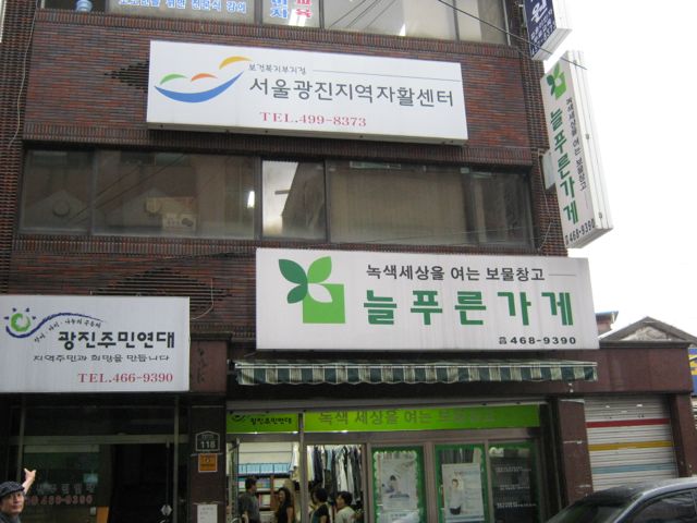 「ソウル廣津地域自活センター」のビル(上の看板)、このビルの2階以上がセンター事務所。