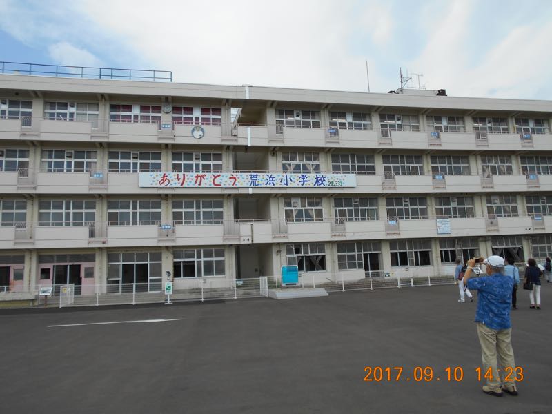 校庭から見た旧荒浜小学校。窓には「ありがとう荒浜小学校」の横断幕が。