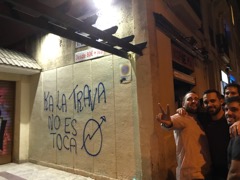 バール外壁。マークは「占拠」の標(しるし)。占拠運動は他の都市にもある。