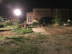 協同組合拠点の側の自給の畑。夜の11時前だが近所のおばさんの団欒と言ったところか。