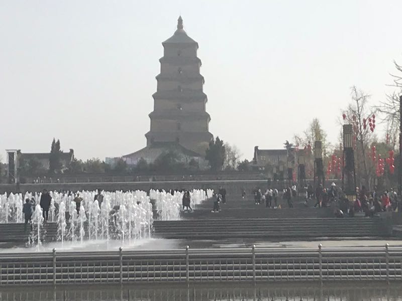 地下鉄から出て噴水前へ。遠景に大雁塔。