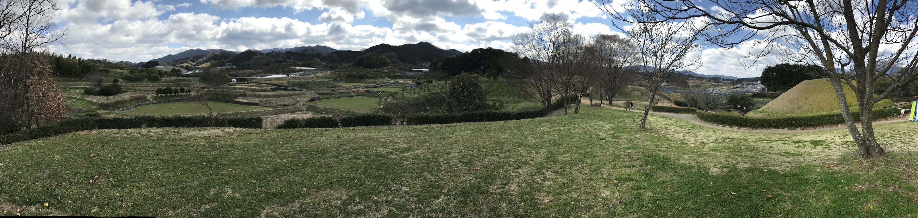 パノラマ写真:高松塚古墳後方の高台から麓を見る
